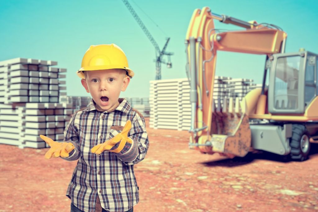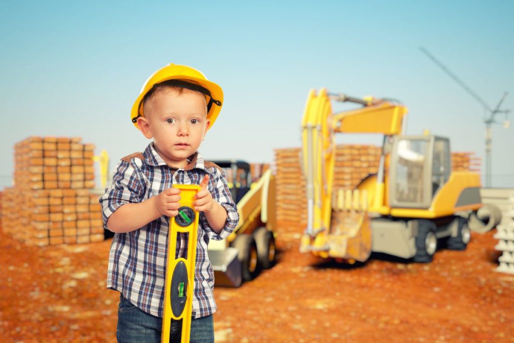 Une grue et une pelle de chantier, une maison à construire et plein de futurs copains et copines.