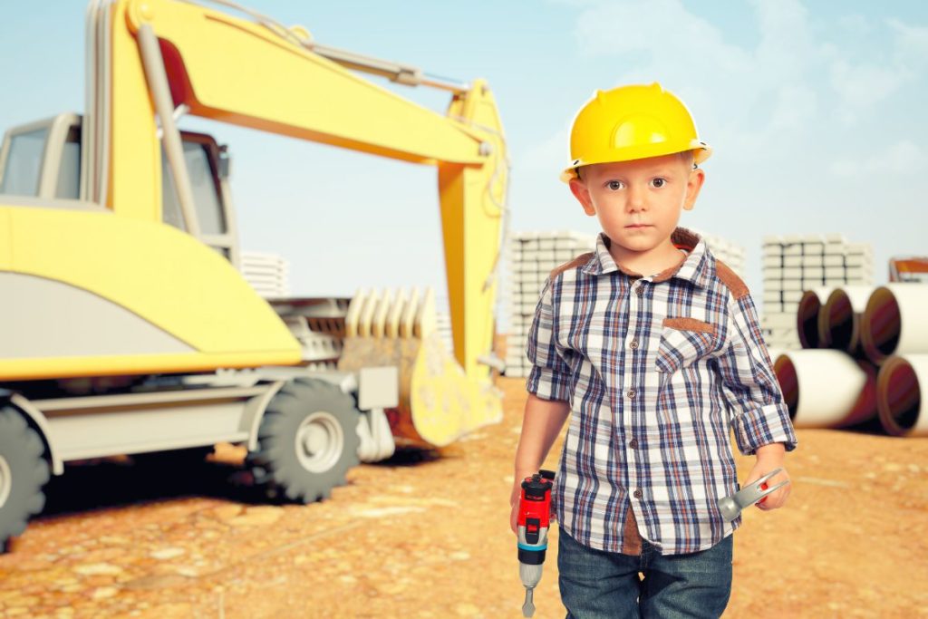 Espace de jeux BTP avec des engins de chantier (grue, pelleteuse, brouette, …). Un espace petit bricolo pour construire, démonter, et créer.